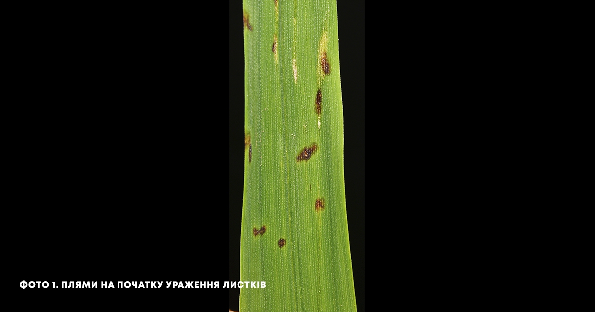 – на початкових етапах – плямистість у вигляді дрібних поодиноких червоно-коричневих плямок (фото 1);